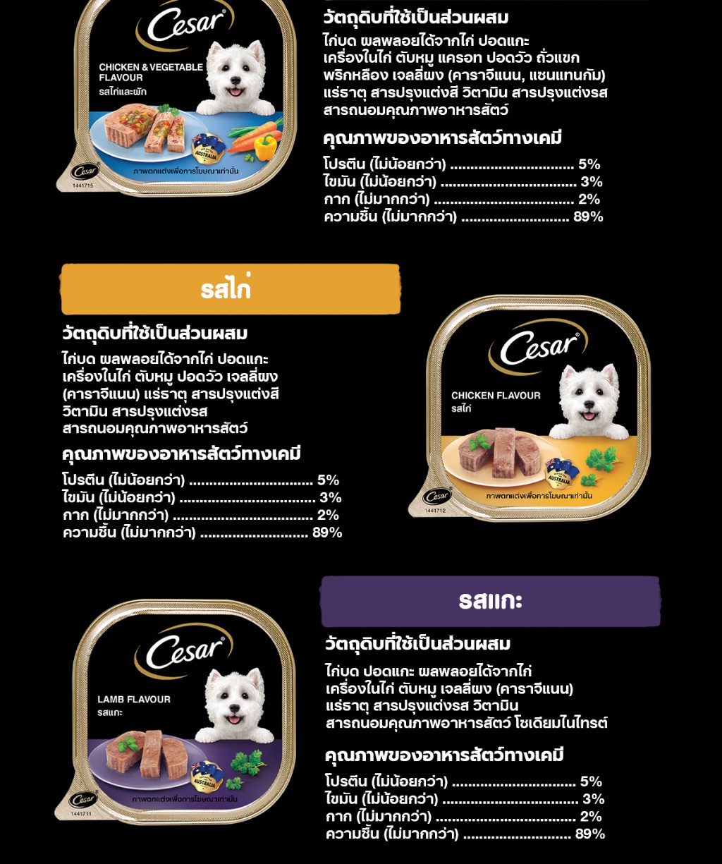 ● มีเนื้อสัตว์เป็นส่วนผสมหลัก: ทุกๆ รสชาติของอาหารเปียกสุนัข CESAR ถูกผลิตขึ้นจากเนื้อสัตว์ที่เป็นส่วนประกอบหลัก เพื่อให้สุนัขของคุณได้รับอาหารที่เข้มข้นและชุ่มฉ่ำ