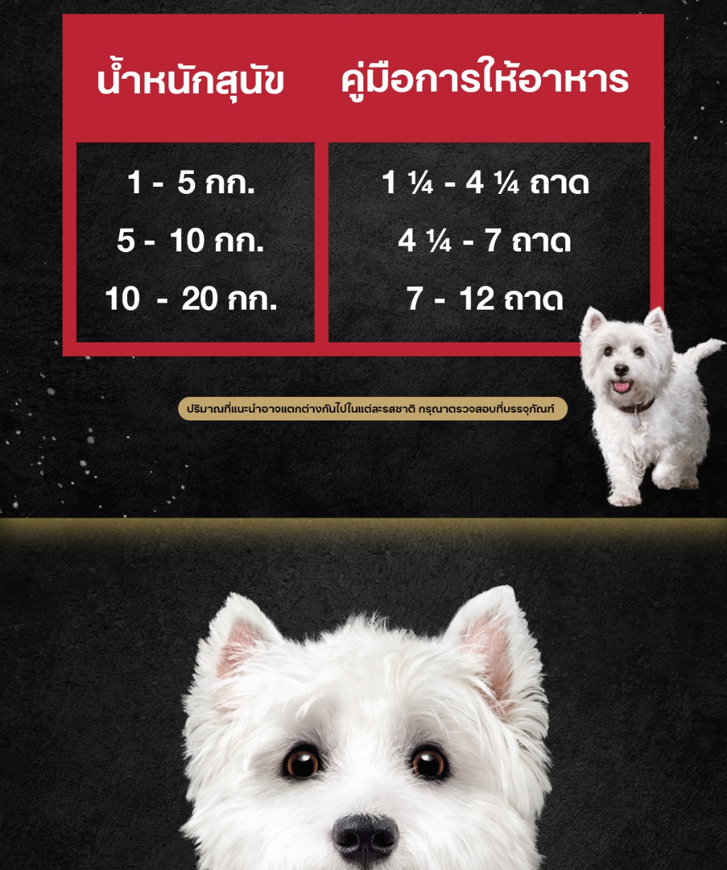 เพื่อให้สุนัขของคุณมีสุขภาพดีและมีความสุขในการรับประทานอาหาร เราขอแนะนำขนาดที่ควรให้ต่อวันตามน้ำหนักของสุนัข ดังต่อไปนี้: